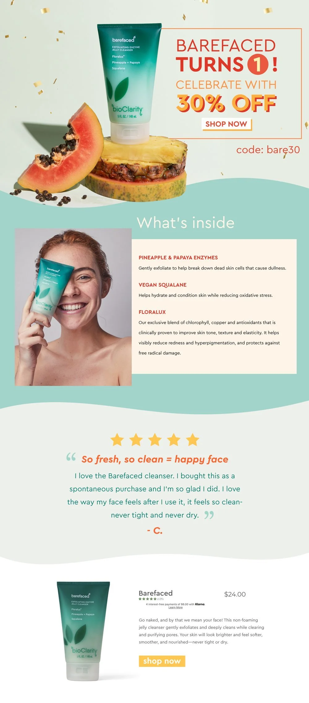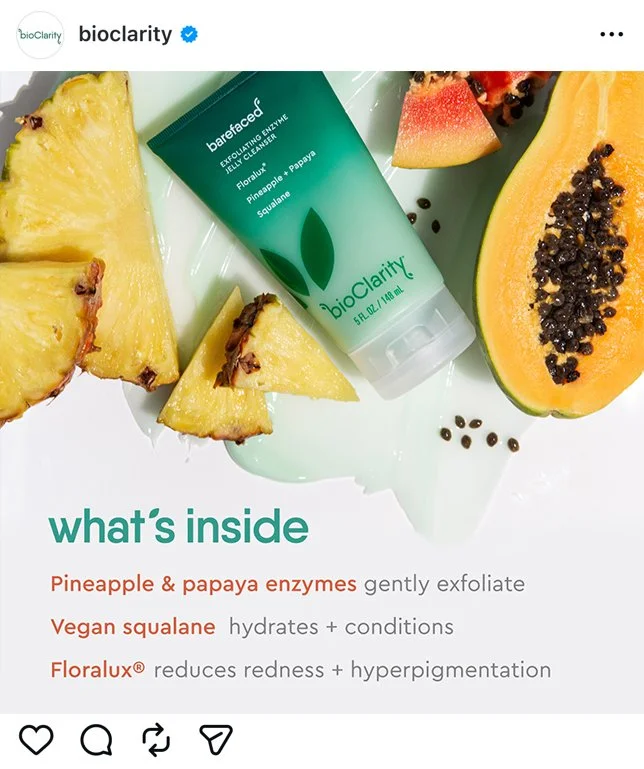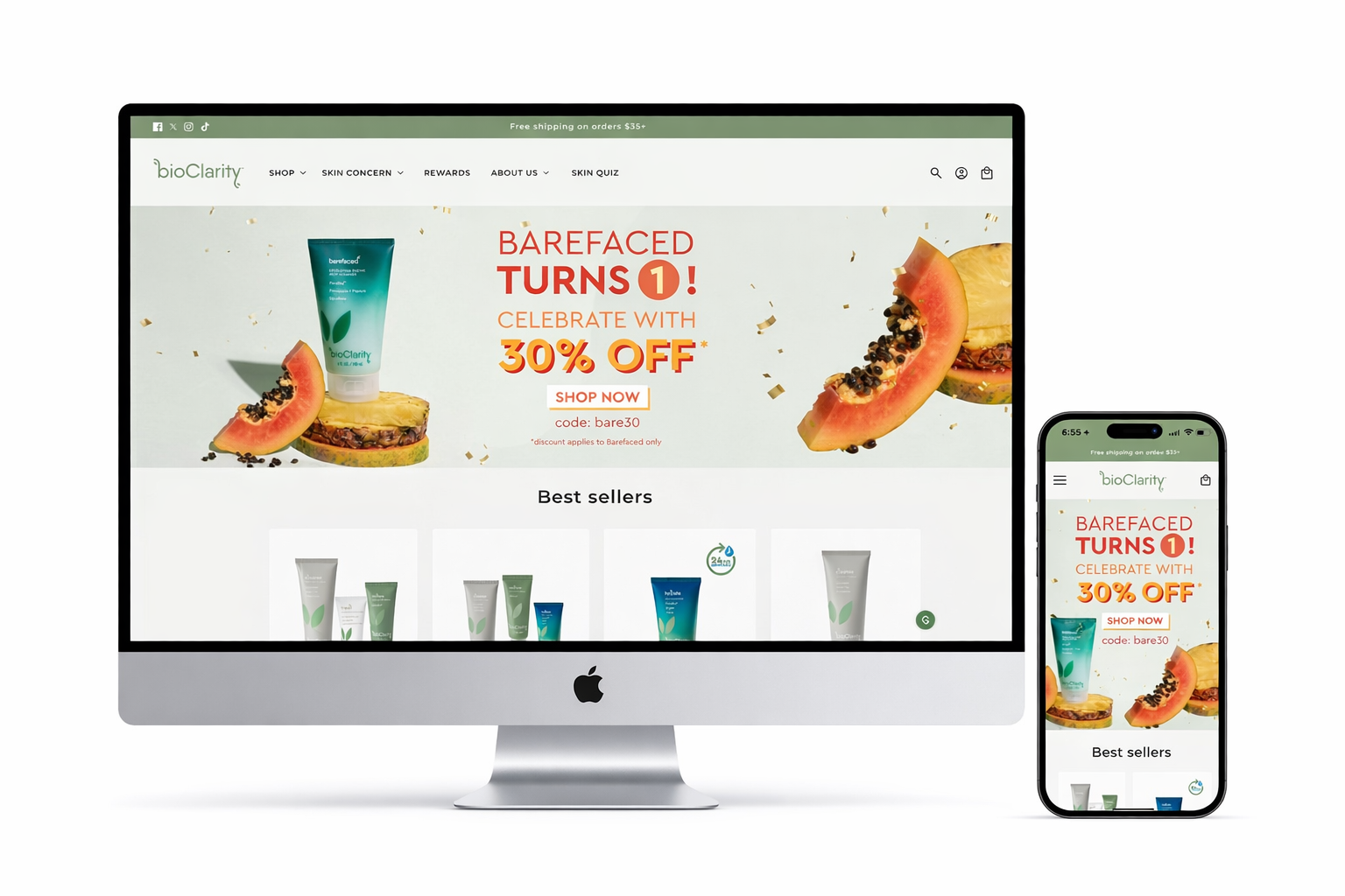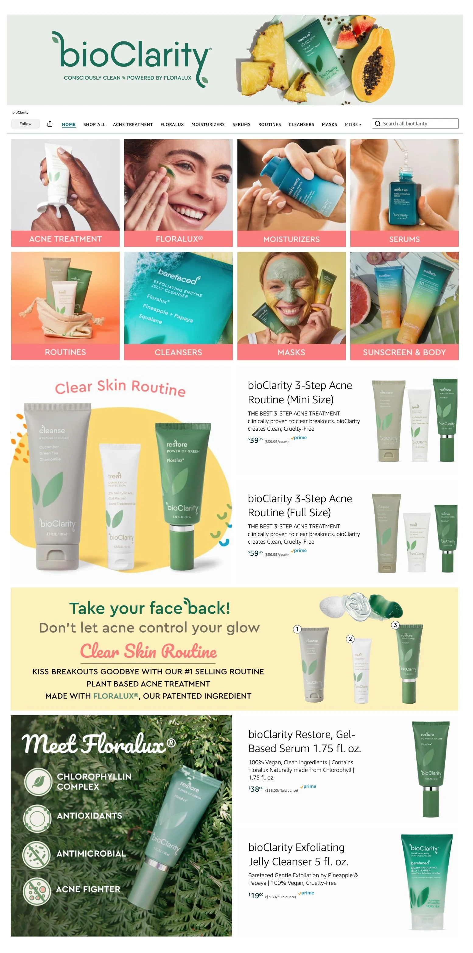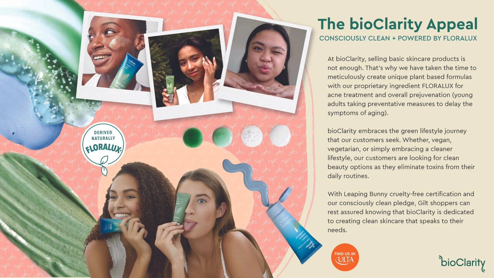 At bioClarity, I collaborated closely with the brand manager to create email, website, packaging, and print designs. One of the biggest challenges I faced was rebranding bioClarity to appeal to Gen Z consumers. bioClarity’s old branding seemed to cater to millennial, and had a very minimalist look. Because the generation is made up of younger adults and teenagers, I faced the challenge of transforming bioClarity into something lively and fresh. By researching trending colors, the brand manager and I settled on tropical inspired colors of coral, warm tones, and palm leaf green.