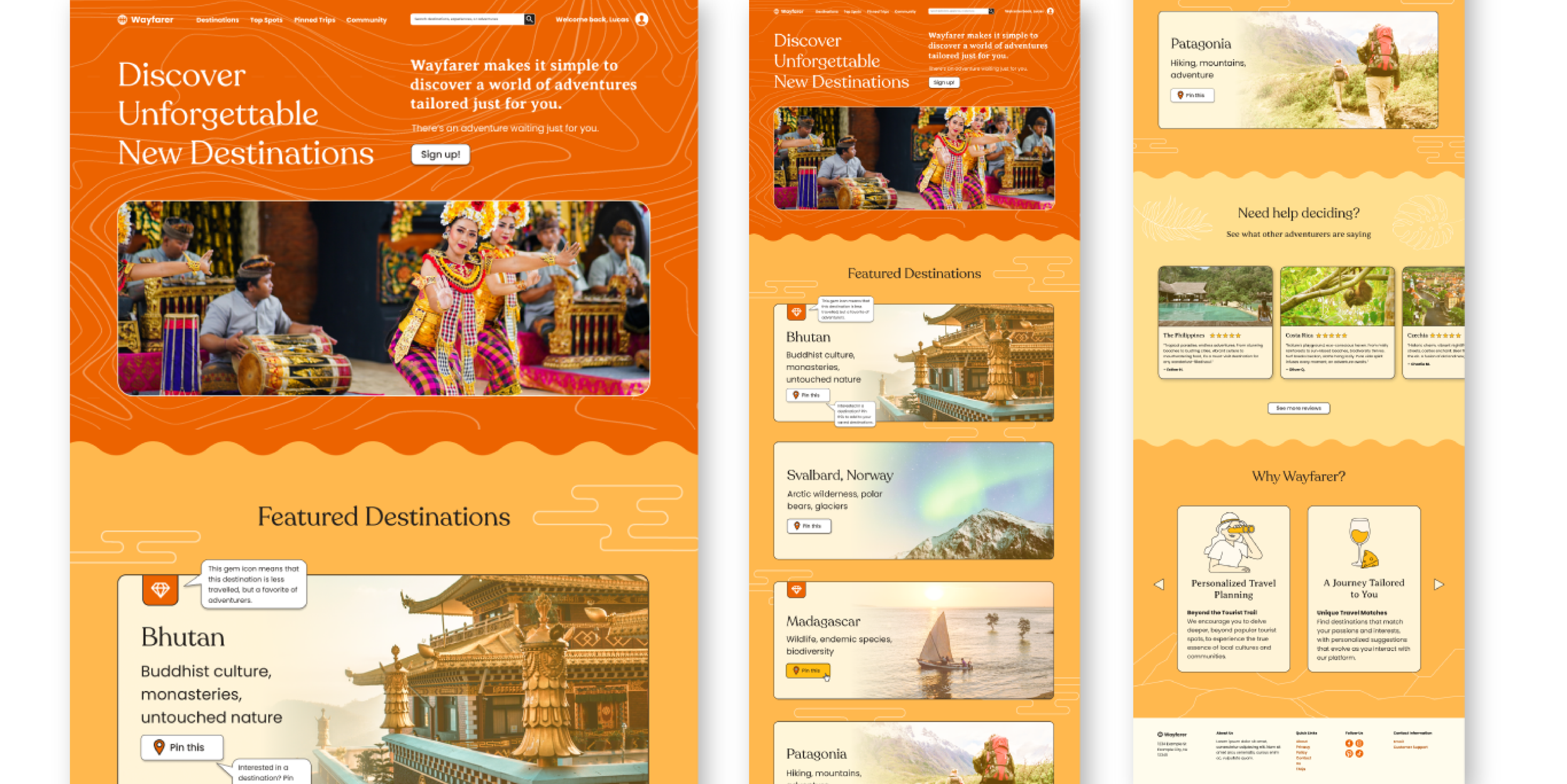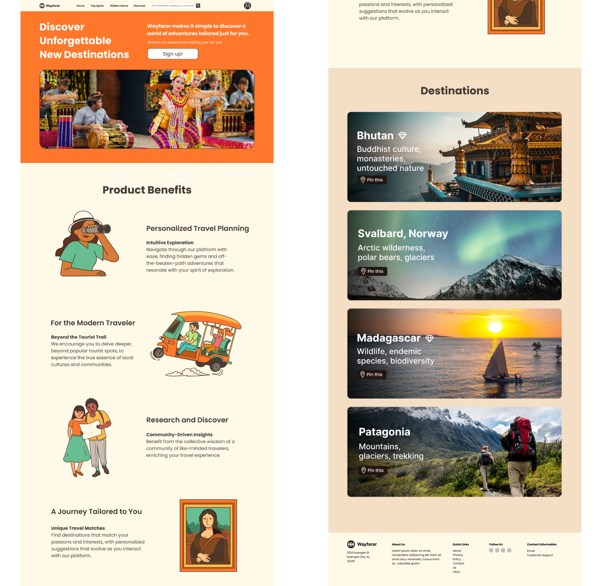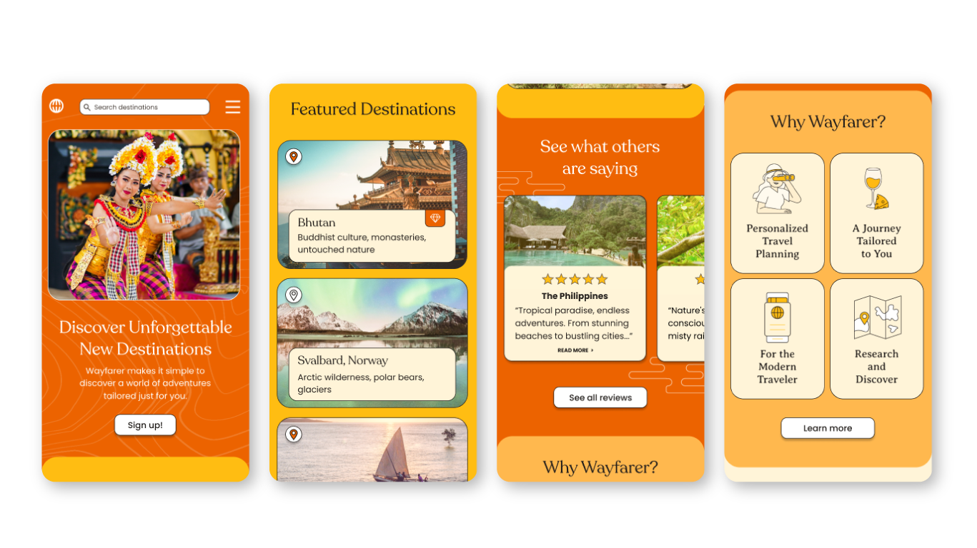 Wayfarer is a mock travel website that encourages travelers to explore destinations that are off the beaten path. I was tasked to create the full brand identity and design website UI components and graphics in Figma. The goal was to design a landing page that appealed to Gen Z consumers. Upon researching new trends in design and social media, I found that bold colors and whimsical shapes were popular. I looked through travel websites through a Gen Z lens, and figured that the minimalist approach looked too serious and outdated. Traveling is fun, and that is what I wanted to communicate through my design.